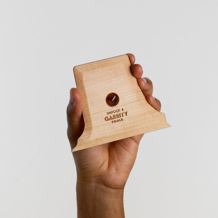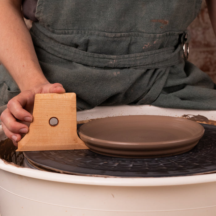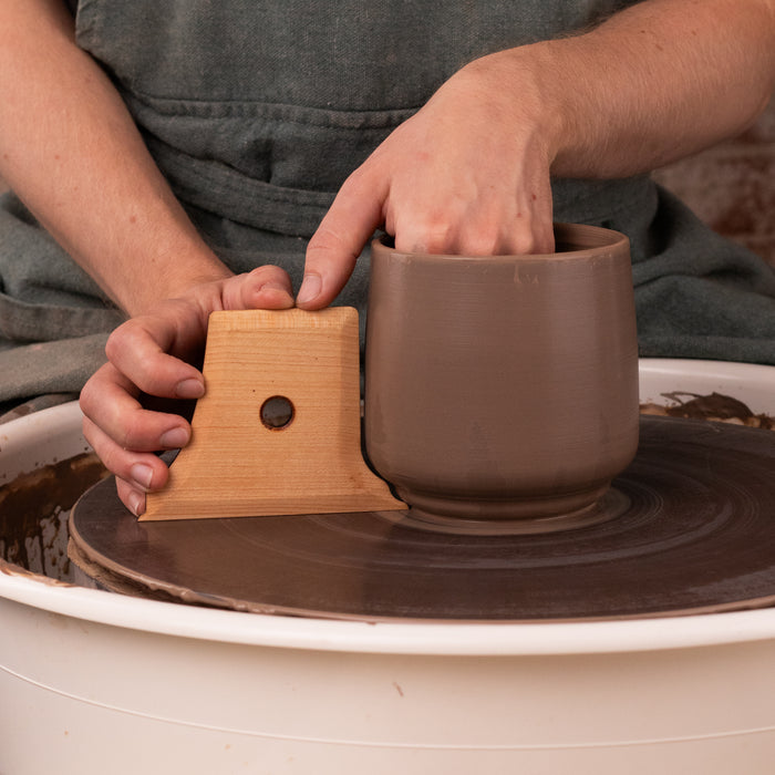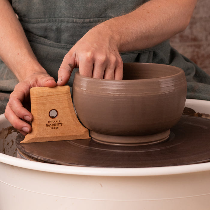 Unfoot 4 provides a simple way to give your clay an elegant lift. One side of the tool creates a soft double curve profile at the base of your vessel and a straightedge to pull your wall. The other side creates a big lift at the base and bell shaped wall. This pottery tool will save you tons of time that you might spend trimming later, and allows you to create the same refined shape again and again.