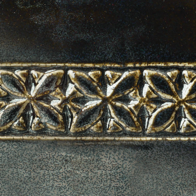 Cosmic Oil Spot is a dark glaze with shimmery flecks that create streams and spots of color similar to a traditional hare’s fur glaze.