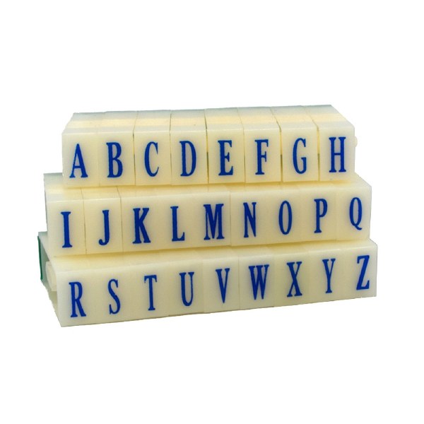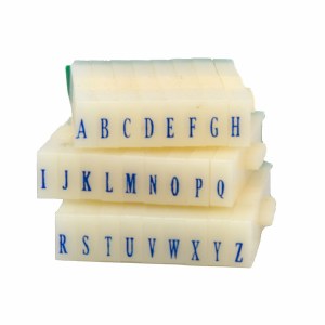 The stamps have a plastic handle with a green rubber face, which is detachable for easy cleaning.