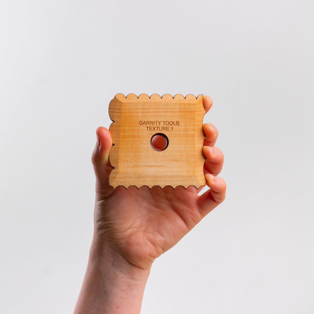 Texture 1 helps you create small and medium waves on your project's clay walls or pointed curves, depending on what side of the tool you use. Each side of Texture 1 pottery tool provides a different pattern that allows you to make a unique yet consistent texture on your vessel or slab and develop new forms in your work.